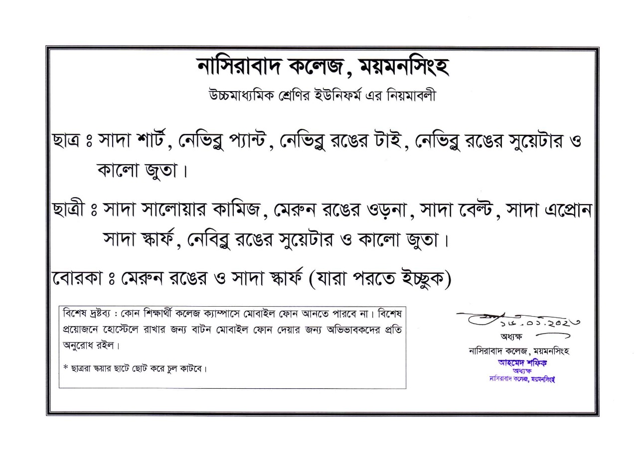 উচ্চমাধ্যমিক শ্রেণীর ইউনিফর্ম এর নিয়মাবলী